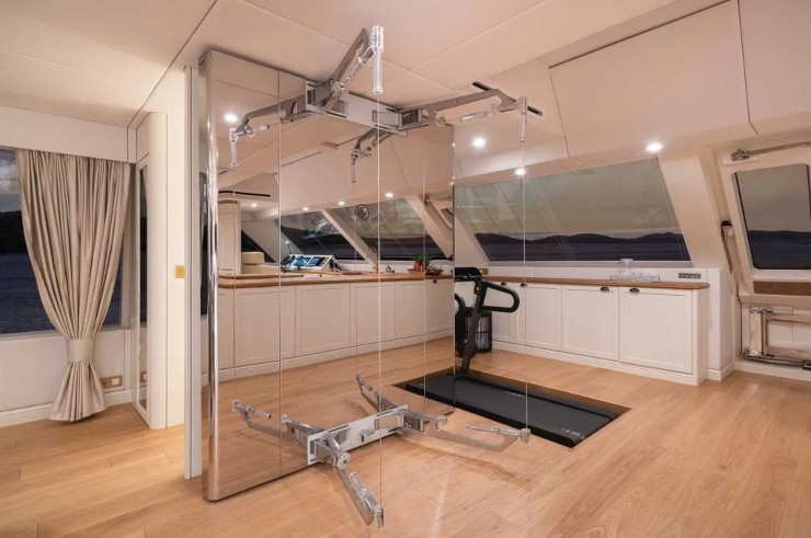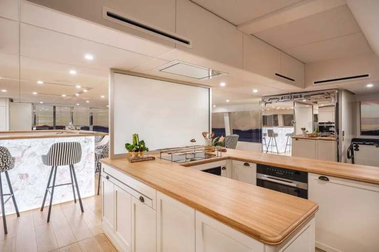 L’armatore può collocare la suite principale sul ponte principale, guadagnando luce, privacy e un rapporto diretto con l’esterno. Le cabine ospiti occupano i due scafi, con bagni en suite e stivaggi generosi; l’area equipaggio è separata e dispone di percorsi dedicati per operare senza invadere le zone ospiti. La cucina può essere resa scenografica (isola a vista) oppure segregata in modalità professionale per charter di alto livello.