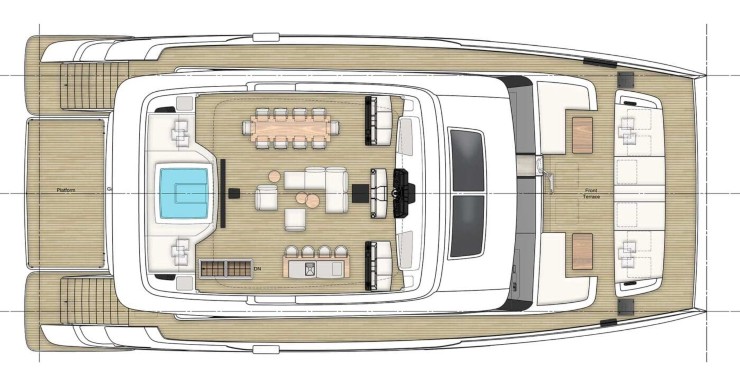 Per il charter top di gamma, la ridondanza di cabine equivalenti sui due scafi e la netta separazione dei percorsi con l’equipaggio consentono un servizio discreto e puntuale. L’ampio flybridge, il pozzetto vivibile e la beach area offrono scenari diversi per intrattenimento e benessere durante la giornata.