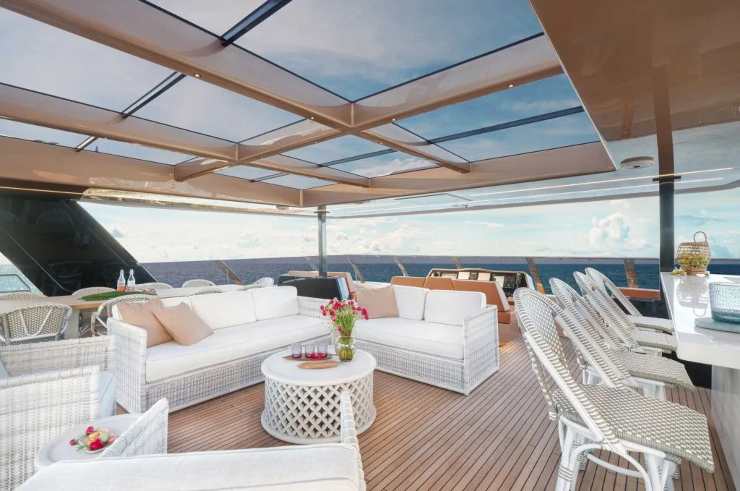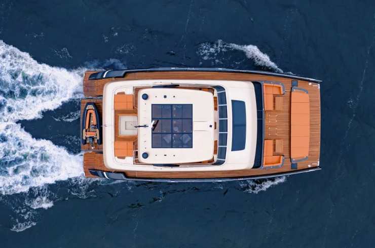 La larghezza complessiva notevole consente un main deck realmente a “open plan”, dove living e dining convivono senza sovrapporsi. A poppa, il pozzetto funziona come patio affacciato sull’acqua; il flybridge diventa una terrazza panoramica attrezzata per socialità e benessere, con zone d’ombra, bar e aree conversazione. I passavanti, protetti e larghi, agevolano movimenti sicuri anche in navigazione.