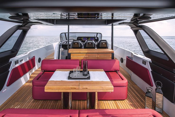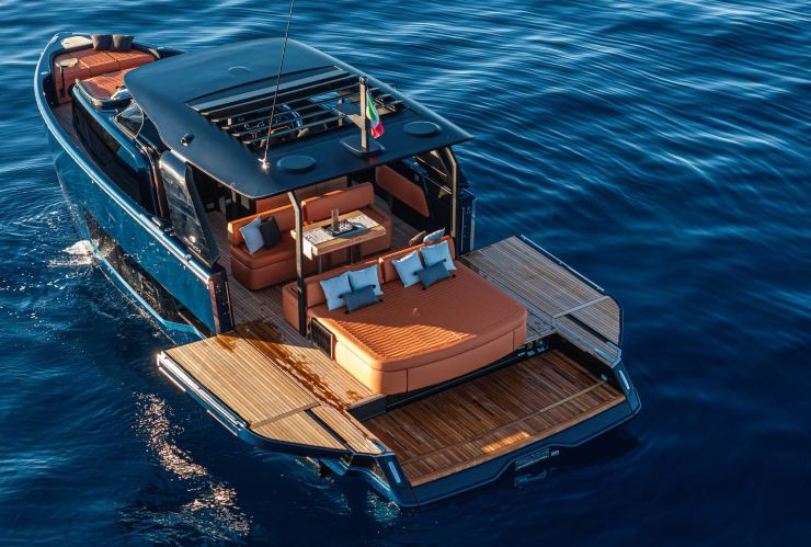 La zona living esterna è un ambiente trasformabile: si passa dalla configurazione lounge a quella dining in pochi gesti, con tavoli telescopici e sedute riconfigurabili. Il blocco cucina integra i servizi indispensabili per una giornata in mare, riducendo i rientri sottocoperta e favorendo una vita a bordo prevalentemente outdoor, come chiede la cultura mediterranea del day boating.
