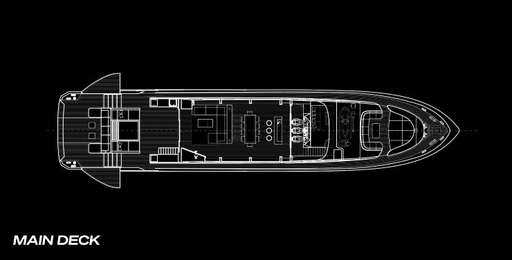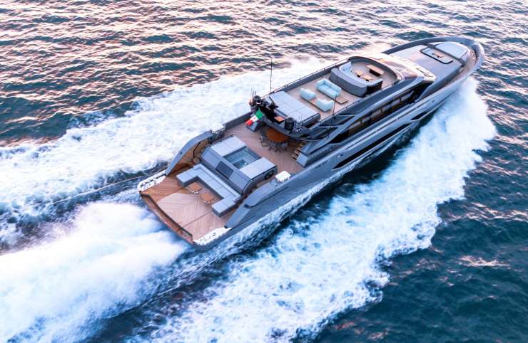 La spinta è affidata a una tripla motorizzazione MTU di fascia elevata, accoppiata a tre idrogetti a controllo elettronico. Ogni linea dispone di intake ottimizzati e condotti studiati per minimizzare perdite e turbolenze. La tri-jet consente accelerazioni pronte, assenza di organi sporgenti sotto lo scafo e risposta immediata alle variazioni di regime. L’assenza di eliche e assi riduce rischi di impatto con fondali o detriti, favorendo accessi a rade poco profonde e ancoraggi vicini alla costa.