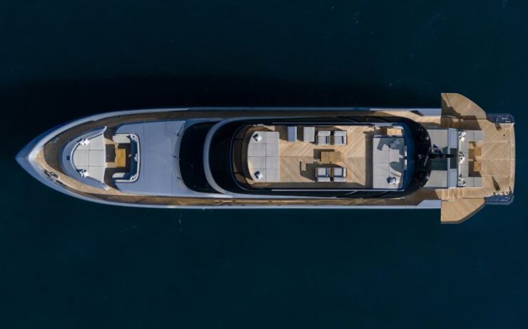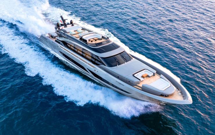 Il 130 presenta valori tipici dell’area 40+ metri con baglio generoso per garantire spazi interni e stabilità intrinseca. La carena, planante, è ottimizzata per l’accoppiamento con tre idrogetti: prua affilata per tagliare l’onda, porzione centrale a resistenze ridotte e poppa con angoli di deadrise calibrati per sostenere portanza e comfort al crescere della velocità. Il bilanciamento è risultato di un’accurata distribuzione dei pesi: sala macchine a tre linee, serbatoi in posizione baricentrica, arredi e impianti disposti per evitare torsioni indesiderate e per limitare gli sforzi su giunti e paratie.