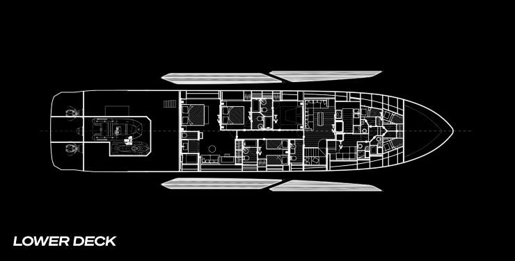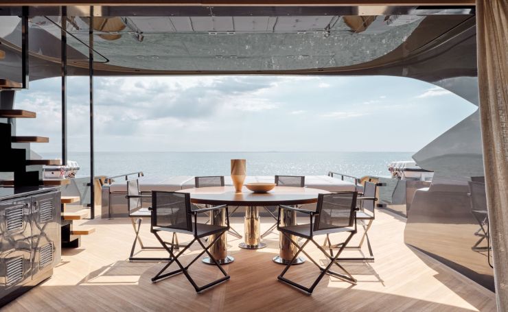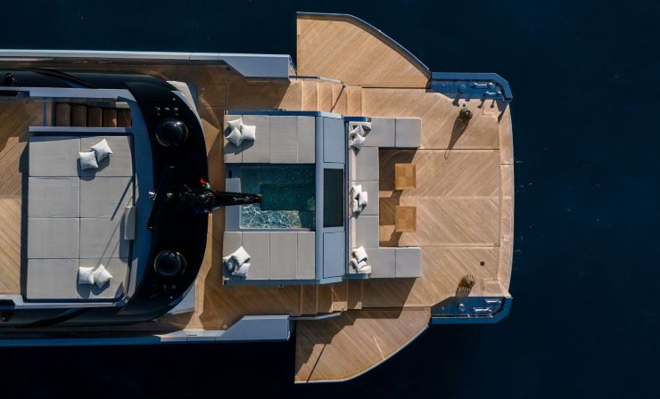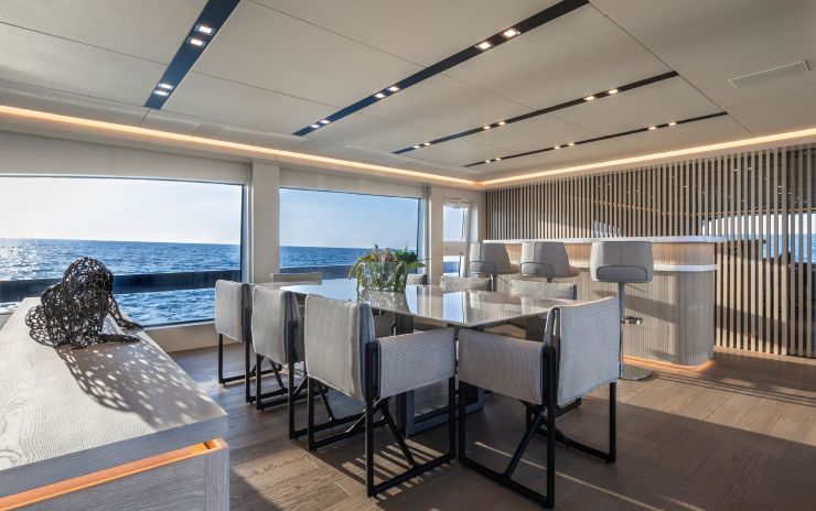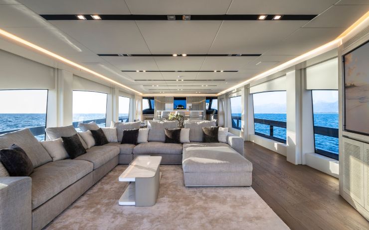 Il salone principale integra zone lounge, dining e media con passaggi liberi, mentre la veranda di poppa crea continuità con l’esterno. La cucina, dimensionata per servizio privato e charter, adotta elettrodomestici di livello professionale e percorsi separati per il personale. Le cabine sono insonorizzate e dotate di impianti di trattamento aria indipendenti, così da mantenere comfort microclimatico senza correnti o sbalzi termici.