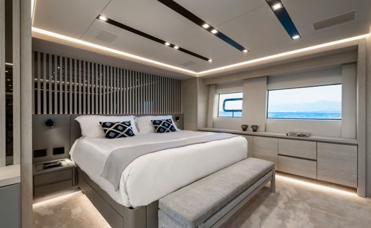 Illuminazione LED dimmerabile, schermature motorizzate, climatizzazione a chiller con fan-coil silenziati e scene preimpostate per living, dining e notte compongono la piattaforma di comfort. L’audio-video è strutturato in zone indipendenti con distribuzione 4K e casse integrate, mentre i rivestimenti fonoassorbenti e i vetri stratificati contribuiscono a mantenere bassi i livelli di rumorosità. In sala macchine, staffaggi antivibranti e pannellature sandwich riducono ulteriormente le trasmissioni meccaniche.