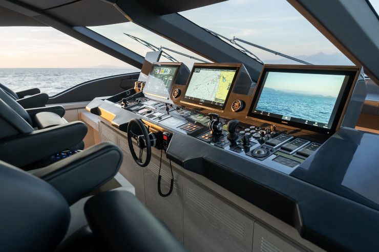 La timoneria è organizzata su display multifunzione a rete: radar doppia banda, ecoscandaglio ad alta definizione, cartografia vettoriale, termocamere e AIS di ultima generazione. L’architettura IT utilizza switch gestiti, Wi-Fi mesh e failover 4G/5G/VSAT per assicurare connettività in navigazione e all’ancora. Gli allarmi sono centralizzati su HMI con interfacce dedicate a motori, impianti fluidici e sicurezza, mentre la registrazione parametri supporta approcci di condition monitoring.