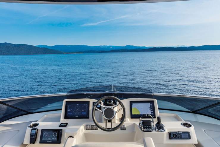 La plancia è disegnata per massima visibilità (parabrezza senza montante centrale) e integra la piattaforma EmpirBus per la gestione domotica (luci, pompe, climatizzazione, utenze) e diagnostica. Previste configurazioni con doppi display da 17” per cartografia, radar e gestione apparati, più portello laterale per l’accesso rapido in banchina.