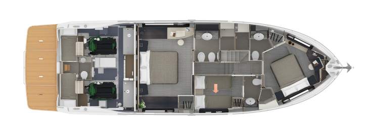 Il ponte inferiore offre una master a tutto baglio a centro barca, VIP di prua con bagno en suite e terza cabina trasformabile (twin unibili elettricamente), più toilette/day-head. Le porte scorrevoli, adottate sistematicamente, aumentano la fruibilità degli spazi e riducono l’ingombro di rotazione. È disponibile locale equipaggio con accesso indipendente dalla piattaforma bagno.