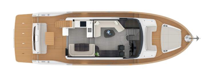 Il main deck presenta una cucina a poppa su banda del camminamento, separabile da un pannello vetrato elettrico: questa soluzione “galley-aft” ottimizza la relazione tra pozzetto e salone in modalità en plein air. Il salone adotta arredi lineari, credenze con stivaggi nascosti, soffitti con strip LED e grandi superfici vetrate. La timoneria rialzata beneficia della portiera laterale per manovre “single-hand”.