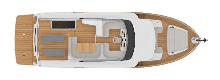 • Flybridge: timoneria centrale, wetbar attrezzato, dinette contrapposte e prendisole; possibilità di hard-top con apertura.