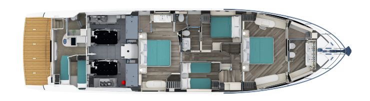 La cabina armatoriale offre ampiezza, luce e una gestione dello spazio molto ben studiata, con area guardaroba e bagno dedicato. La VIP centrale gode a sua volta di proporzioni generose e di un livello di privacy raro nella categoria. Le cabine ospiti completano il layout con un approccio pragmatico ma curato, garantendo funzionalità senza percepirsi come spazi residuali.
