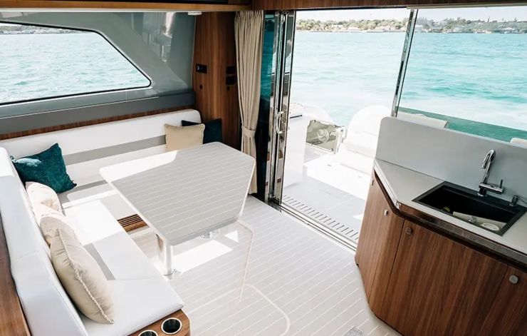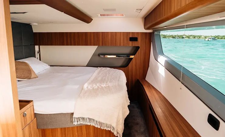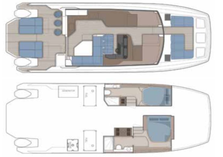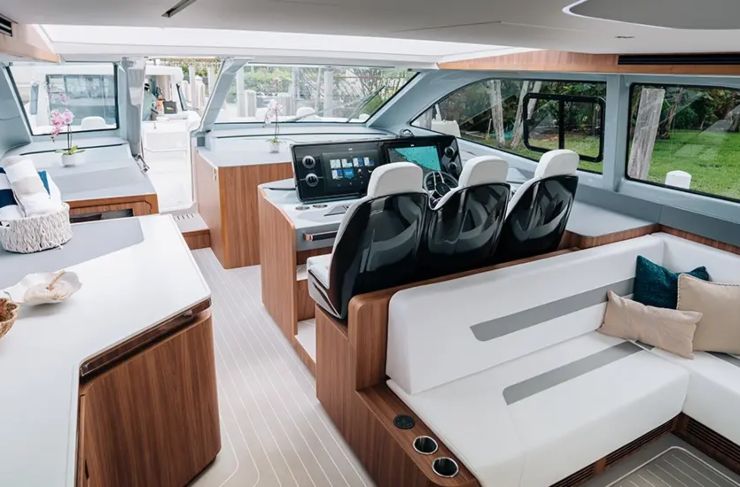 - Layout: 2 cabine / 2 bagni, salone open-plan, lounge di prua, pozzetto “bar window”