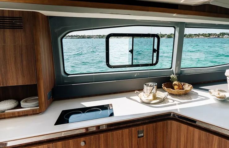 Il baglio di 5,46 m è portato molto in avanti, generando un’area di prua protetta e fruibile anche in navigazione, con sedute lounge e passaggio diretto centro-prua dal salone. Il main deck si gioca su un piano unico, con galley completa a sinistra (induzione, refrigerazione sottobanco, storage) comunicante col pozzetto tramite finestra basculante; a dritta grande dinette con tavolo hi-lo a scomparsa che, a filo pagliolato, libera area per eventi o si trasforma in cuccetta supplementare. La cabina armatore (scafo dritto) è impostata trasversalmente per sfruttare le altezze (≈2,07 m in ingresso), con ampie finestrature e bagno en-suite separato; ospiti nello scafo sinistro, anch’esso con servizio privato e doccia.