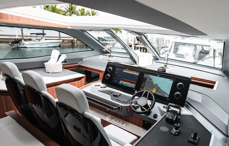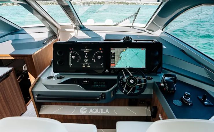 - Plancia: doppie MFD Simrad fino a 22’’, integrazione C-Zone per monitoraggio/controllo carichi, autopilota e illuminazione; schermo centrale sulla corona del timone per comandi rapidi (AP, VHF, luci, media) tramite paddles.