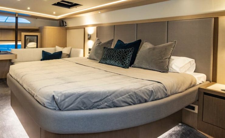 La protagonista assoluta del ponte inferiore è la suite armatoriale full-beam, che sfrutta l’intero baglio del catamarano (circa 27 piedi) e offre un ambiente paragonabile a quello di un appartamento di città: letto matrimoniale king-size, area lounge con seduta e tavolino, grande armadio guardaroba e bagno privato con doppi lavabi e doccia walk-in. Le grandi vetrate sul mare creano un contatto visivo costante con l’esterno, esaltato anche dalla scelta di arredi e materiali dai toni chiari.