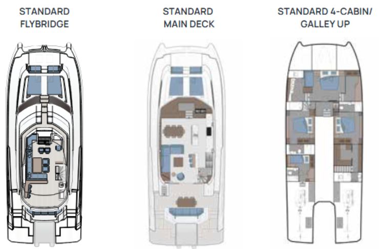 L’Aquila 70 può essere configurata fino a 5 cabine con 5 bagni, comprendendo due ampie VIP con letti queen-size e ampie finestrature laterali, oltre a ulteriori cabine per ospiti o equipaggio. In alternativa, per armatori privati che privilegiano spazi giorno più ampi, è possibile adottare layout a 3 o 4 cabine, con cucina “up” o “down” e salone particolarmente generoso.