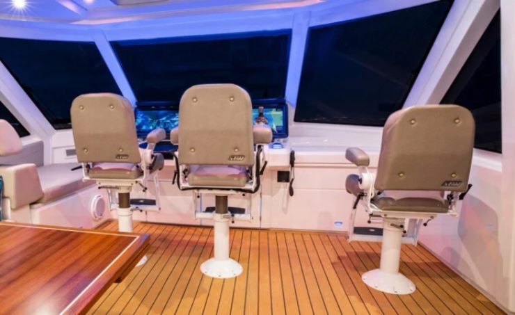 Il flybridge – vero “ponte superiore” dell’imbarcazione – offre una superficie notevole, organizzata in zona timoneria, area pranzo, wet-bar e solarium. In configurazione sky-lounge chiusa, il perimetro vetrato e l’hardtop trasformano questo ponte in un salone panoramico climatizzato, paragonabile, per metratura utilizzabile, a quello di un monocarena di oltre 30 metri.