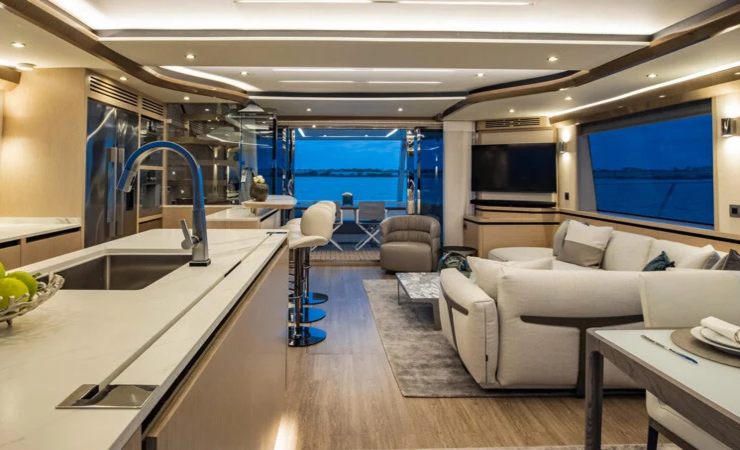 La cucina – che l’armatore può scegliere di posizionare sul main deck (galley up) o nei hull (galley down) – adotta elettrodomestici di livello domestico: piani a induzione, forni combinati, cantinette vino, ampie superfici di lavoro. Il tutto inserito in un layout che facilita il lavoro dell’equipaggio senza interferire con le zone relax degli ospiti.