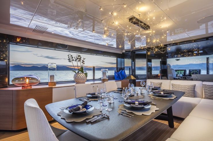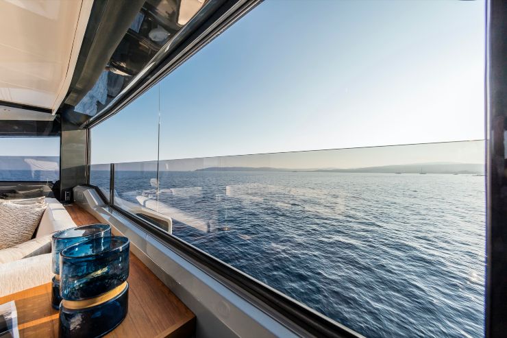 Partenza a regime moderato, salone arioso con viste continue sul mare, pranzo semi-aperto grazie alle aperture scorrevoli, ancoraggio in baia con sistemi di stabilizzazione attivi e serata in lounge con illuminazione calibrata dalla domotica. Nelle giornate più calde, schermature e HVAC mantengono il microclima; nelle mezze stagioni, le vetrate trasformano la zona giorno in una veranda temperata.