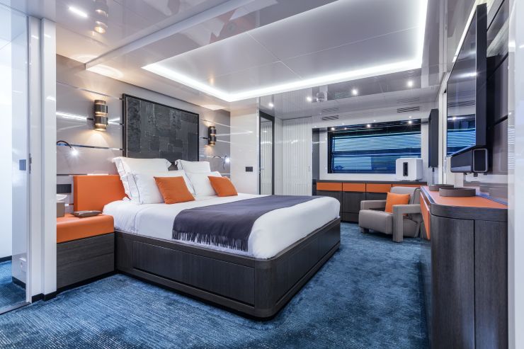 Il comfort non è affidato a un singolo accorgimento, ma a molte scelte che si rafforzano a vicenda: layout trasversali ampi, corridoi liberi, sedute centrali che liberano i passaggi laterali, finiture morbide al tatto, assorbimenti mirati in aree sensibili. La firma acustica dell’imbarcazione è uno dei tratti distintivi; a velocità di crociera la conversazione in salone rimane naturale e l’eco di fondo non affatica durante lunghe tratte.