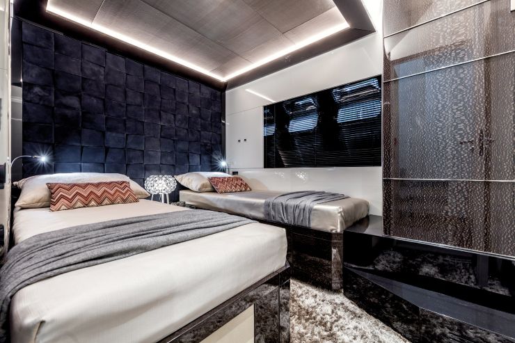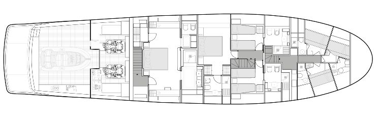 La configurazione più apprezzata prevede quattro cabine ospiti tutte con bagno en suite, con opzione per la quinta cabina per portare la capienza a dieci ospiti. L’area equipaggio è progettata con percorsi separati per minimizzare le interferenze con la vita di bordo, garantendo servizio efficiente e privacy. La sala macchine è raggiungibile in sicurezza, con percorsi tecnici logici e compartimentazioni studiate per la gestione degli impianti.