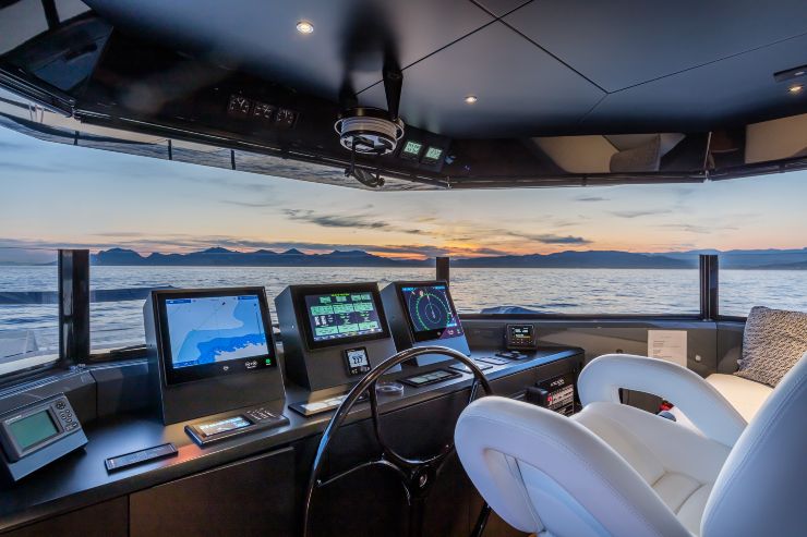 La postazione di governo raccoglie strumentazione multi-display per governo, navigazione e monitoraggio impiantistico. Le interfacce raggruppano radar, cartografia elettronica, autopilota e sensori ambientali, mentre i pannelli di controllo impianti consentono la gestione da un’unica logica. L’integrazione evita ridondanze non necessarie e riduce la complessità cognitiva durante la condotta.