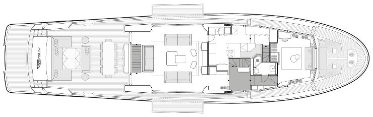 L’A105 predilige open space fluidi, con il salone principale che si espande verso poppa attraverso grandi aperture scorrevoli. Le aree pranzo possono essere interne o esterne senza soluzione di continuità, e l’upper deck ospita un salone panoramico convertibile che si apre su un’ampia zona relax poppiera. A prua sono possibili varianti che includono studio privato, playroom o una quinta cabina a seconda del profilo d’uso.