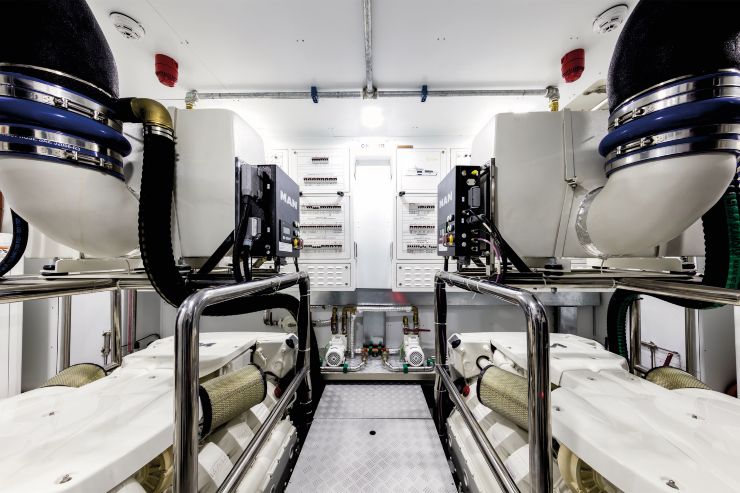 La configurazione più diffusa prevede una coppia di propulsori V8 di 1.000 cavalli ciascuno, in linea d’asse, con riduttori dimensionati per sfruttare la coppia ai regimi medio-bassi. La scelta è coerente con la filosofia semi-dislocante: potenze che non inseguono picchi velocistici, ma regolarità d’erogazione, consumi ragionevoli e facilità di gestione. In termini manutentivi, l’accessibilità dei filtri, dei circuiti di raffreddamento e dei quadri di controllo risulta adeguata a interventi on-condition senza compromettere gli spazi dell’equipaggio.