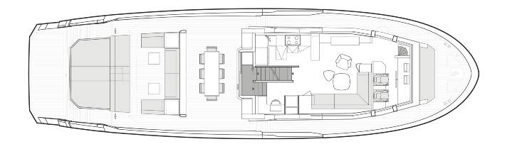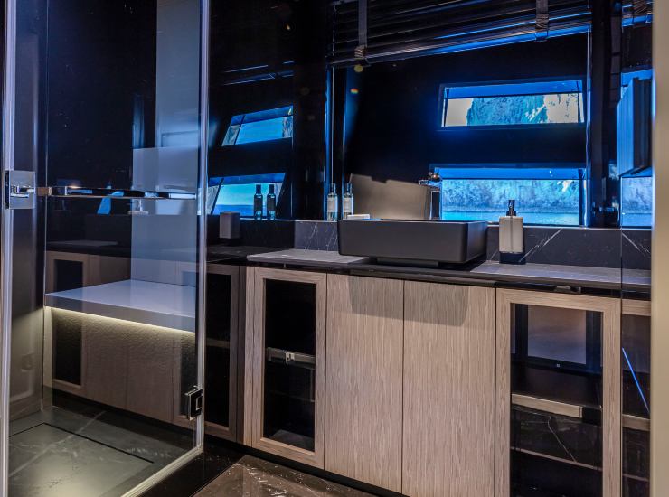 Lo Sherpa 80 parla un linguaggio diverso dal classico fly sportivo: la sua estetica è più “costruita”, meno filante, volutamente solida. La sovrastruttura ampia e i tagli vetrati generano un profilo riconoscibile, mentre i ponti sono organizzati come una sequenza di ambienti, ciascuno con una funzione precisa. Il lusso, qui, non coincide con l’eccesso: coincide con la qualità d’uso.