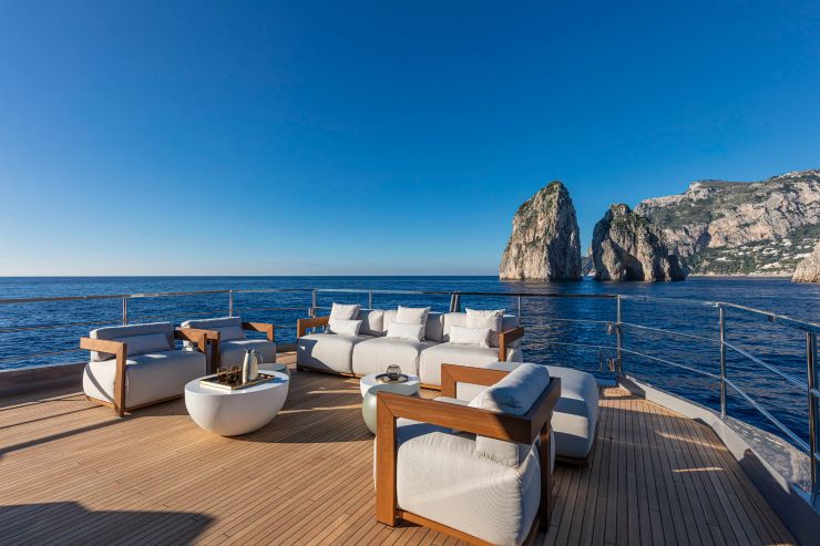 Il cuore del progetto è la percezione di spazio: vetrate, porte ampie, luce naturale e una transizione tra ambienti interni ed esterni che riduce le separazioni. Se il sistema di ombreggiamento e la climatizzazione sono correttamente dimensionati, il main deck resta fruibile anche nelle ore calde, trasformando lo yacht in una vera “casa sul mare”, non in un set fotografico.
