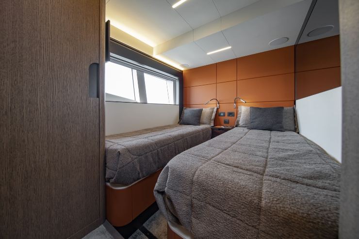 Le cabine ospiti, se correttamente dimensionate, evitano la tipica compressione dei 60–70 piedi più spinti: qui la sensazione è orientata a un comfort quotidiano, non a un semplice conteggio dei posti letto.