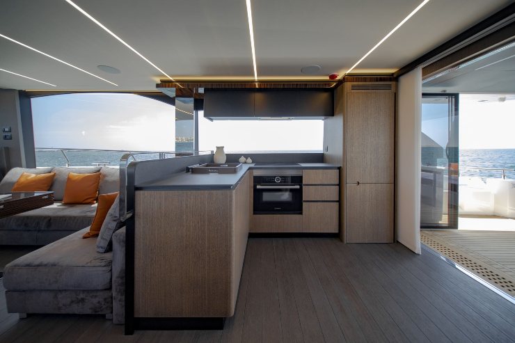Il flybridge è progettato come piattaforma di intrattenimento: area timoneria, lounge, prendisole e, nella logica di allestimento più richiesta, una zona cucina esterna che rende il ponte superiore autonomo e centrale nella giornata. Per l’uso mediterraneo è una soluzione perfetta: a rada si vive sopra, con ventilazione naturale e vista dominante; il main deck rimane un’area di supporto e di rappresentanza, senza “dover” essere sempre il fulcro.