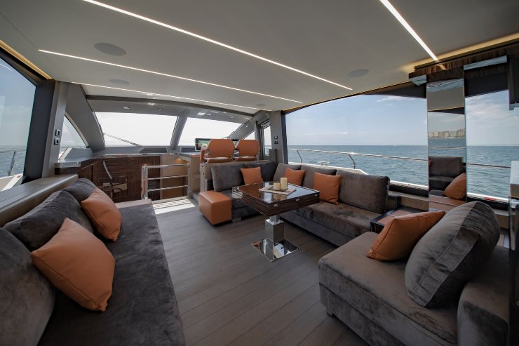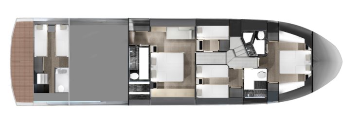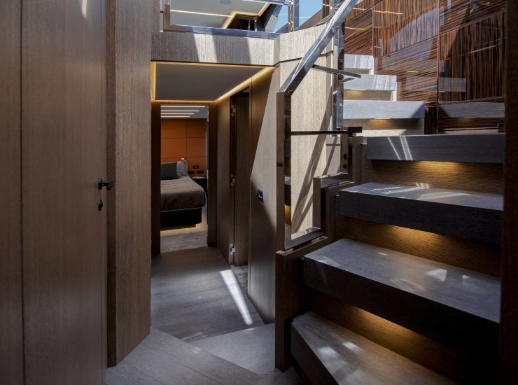 Il ponte principale si distingue per l’uso importante delle superfici vetrate: non è solo estetica, è una scelta che amplia il salone “per percezione”, migliora la vivibilità e crea un ambiente panoramico coerente con un prodotto di lusso contemporaneo. La distribuzione è orientata alla socialità, con passaggi fluidi e zone di seduta che non intralciano la circolazione. La barca, in altre parole, è pensata per essere vissuta da più persone senza che la presenza di ospiti diventi un impedimento.