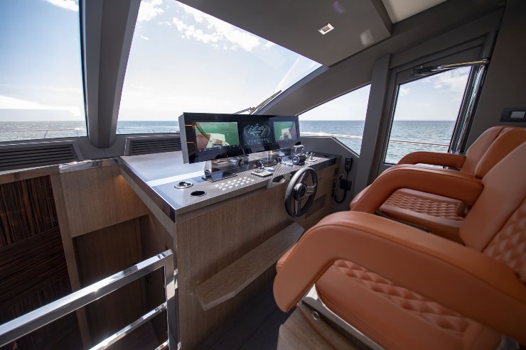 Su un flybridge moderno, la timoneria deve conciliare tre esigenze: leggibilità sotto sole intenso, ergonomia per navigazioni lunghe e accesso immediato ai comandi critici. L’architettura IPS, quando scelta, tende a migliorare ulteriormente l’esperienza, perché la manovra diventa più lineare e meno dipendente dalla “forza” del timoniere. Il 66, per impostazione, privilegia una plancia funzionale: spazi corretti, sedute pensate per conduzione prolungata e un’impostazione che favorisce la sicurezza operativa.