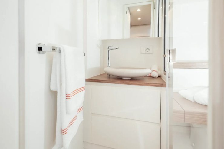 La cabina è realizzata con combinazioni di essenze chiare, pelli e tessuti marini, superfici verticali studiate per massimizzare la riflessione della luce naturale. La zona bagno introduce elementi in HPL e vetro per controllo di peso e igienicità. Gli imbottiti in coperta impiegano schiume ad alta resilienza e rivestimenti specifici UV/salsedine.