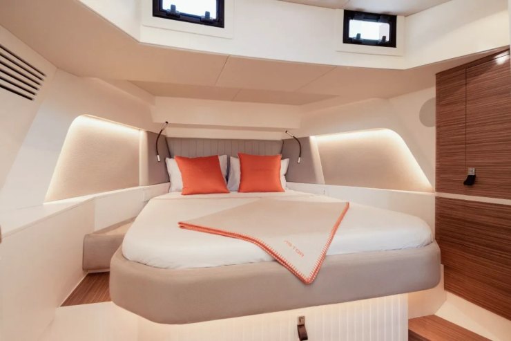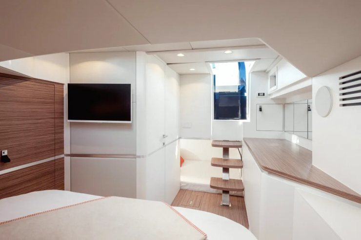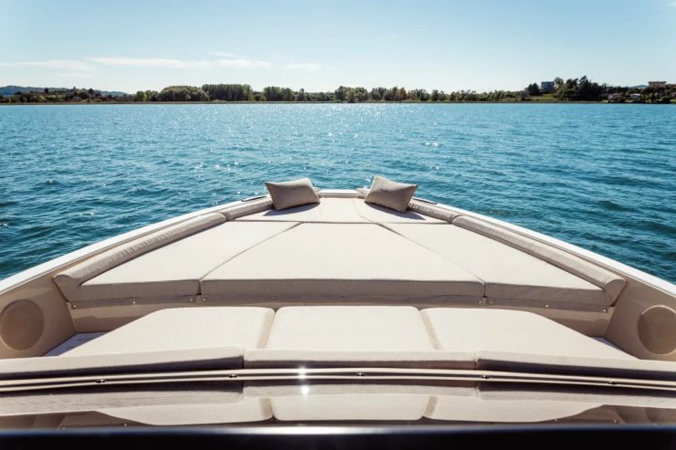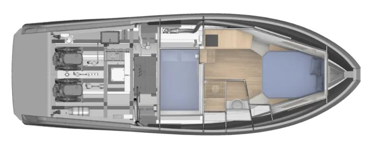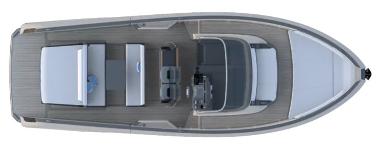 Il piano di coperta è walkaround puro: passavanti larghi e protetti da coaming alto, corrimani ben distribuiti, prua attrezzata come area conviviale con sunpad e movimenti lineari. Un T-top integrato schermal’area di guida e la dinette poppiera, con predisposizioni per illuminotecnica e impianti. Il pozzetto, profondo e modulare, ospita sedute convertibili e un wet bar equipaggiabile con frigoriferi, grill, fabbricatore di ghiaccio.