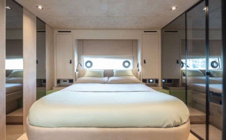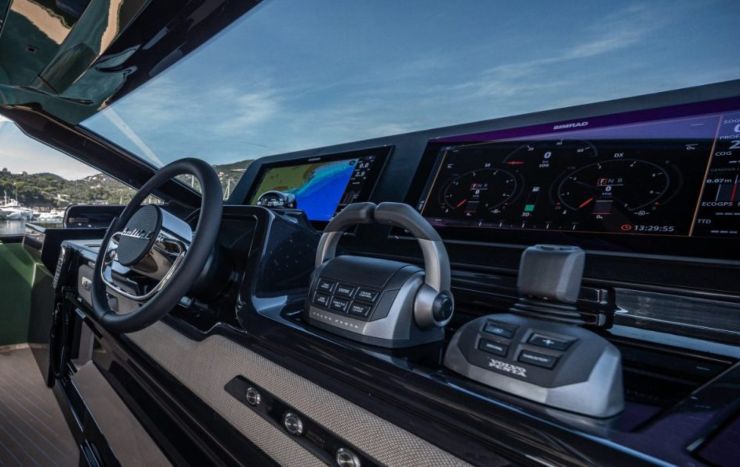 La plancia prevede tre sedute e doppi display multifunzione; i comandi principali sono fisici e ridondati su bus digitale. La domotica gestisce luci, pompe, HVAC, livelli e allarmi con logiche chiare. Cablaggi numerati, passacavi imbustati, quadri protetti e spazi di servizio rendono la diagnostica rapida. Radar, eco adatto alle velocità, telecamere di cortesia e sensori di bordo completano un set “pro”, pensato per chi usa la barca davvero.