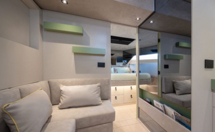 Il pozzetto è una stanza all’aperto riconfigurabile: tavoli estensibili, divani con cuscinerie profonde, wet-bar completo, prendisole generosi. Con le ali laterali aperte, il perimetro utile si dilata e la barca “respira”. La plancia a tre posti riduce la fatica del comandante nei trasferimenti lunghi e consente turni con l’equipaggio. Illuminazione di cortesia e schermature integrate permettono di vivere esterni anche nelle ore calde o in serata.