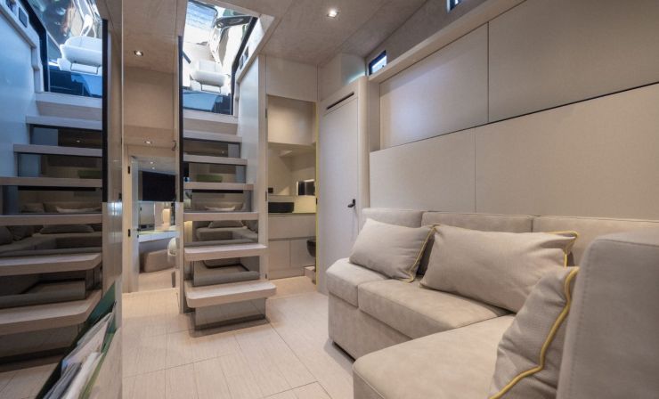 Fuori, linee teso-morbide, prua piena ma non invadente, tuga bassa per visibilità, hard-top strutturale su montanti inclinati. Le murate abbattibili trasformano il pozzetto in terrazza sull’acqua, mentre la piattaforma bagno crea continuità d’uso. Davanti, un salotto ribassato ripara dal vento; sotto, la dinette centrale distribuisce ai tre quartieri notte, tutti con bagni capaci e docce separate. Ergonomia di corrimani, altezze e gradini uniformi limita inciampi e affaticamento.