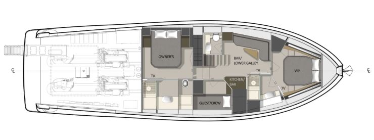 L’impostazione generale privilegia velocità di crociera sostenute e consumi equilibrati, senza inseguire primati fini a sé stessi. Il risultato si percepisce subito: assetto stabile in accelerazione, rumorosità filtrata, manovre al joystick prive di stress. Sottocoperta, tre cabine e tre servizi compongono un ambiente dove silenzio, altezze e passaggi sono stati ponderati con criterio navale, non con logica di show-room. È un 58’ che fa bene il lavoro per cui nasce: portare lontano in comodità e riportare a casa con il sorriso.