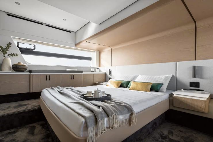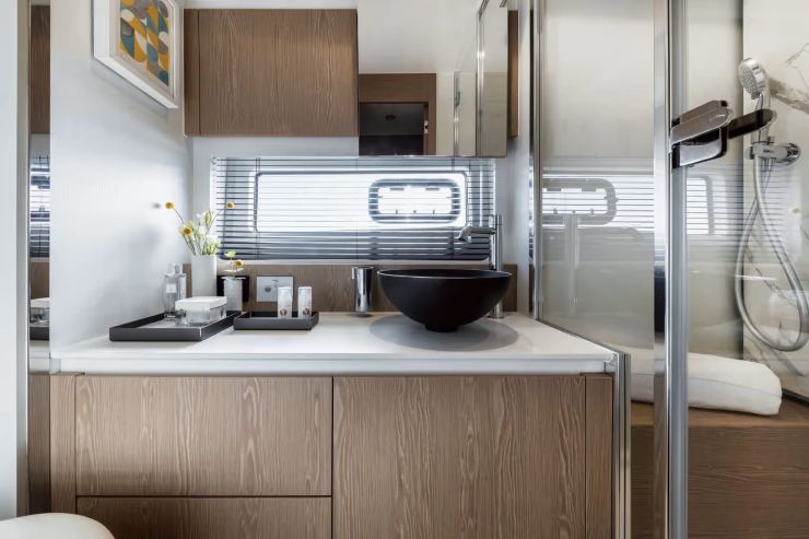 Scendendo al ponte inferiore si accede alla zona notte, organizzata in tre cabine. L’armatore dispone di una suite full beam a centro barca, dove il letto matrimoniale è posizionato longitudinalmente e circondato da ampie superfici vetrate. Armadi, cassettiere e una zona dedicata a vanity o studio permettono di vivere la cabina per periodi lunghi senza sensazione di compromesso. Il bagno privato è completo di box doccia separato e sanitari di livello residenziale.