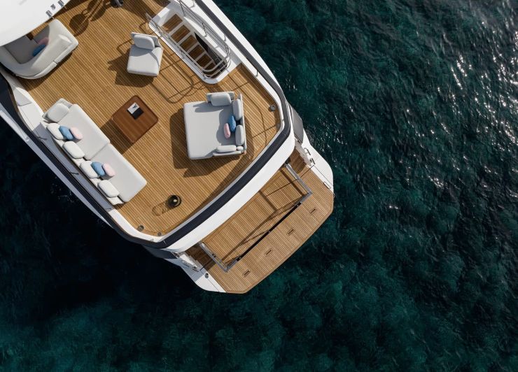 La zona di poppa rappresenta una delle innovazioni più evidenti. Il portellone si apre e si estende fino a portarsi alla stessa quota del ponte principale, originando una piattaforma continua che unisce beach area e pozzetto. Questo sistema, identificato dal concetto Deck2Deck™, permette di passare da una configurazione tradizionale da pozzetto a un vero “salotto sul mare”.