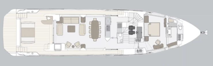 - Ponte principale: pozzetto, grande salone panoramico, zona pranzo, cucina e suite armatoriale a prua.