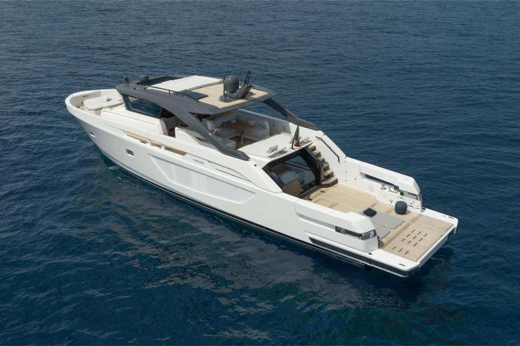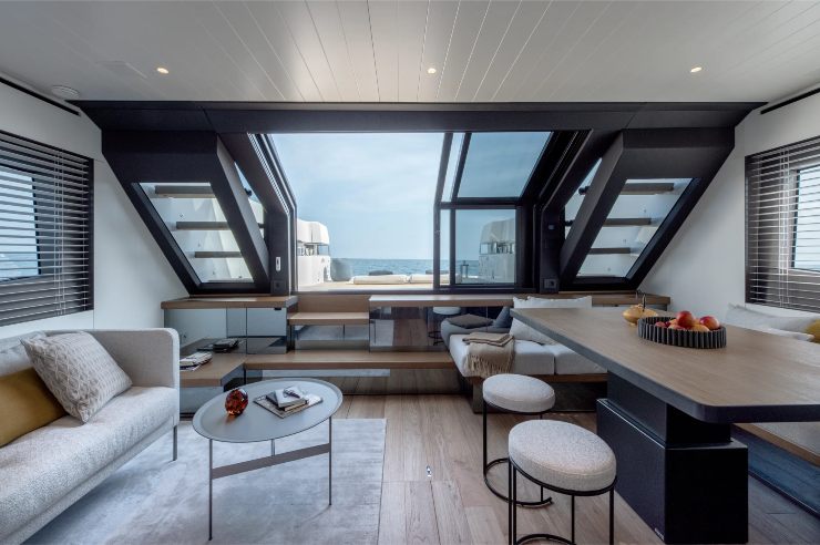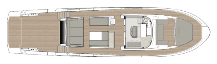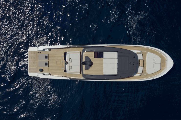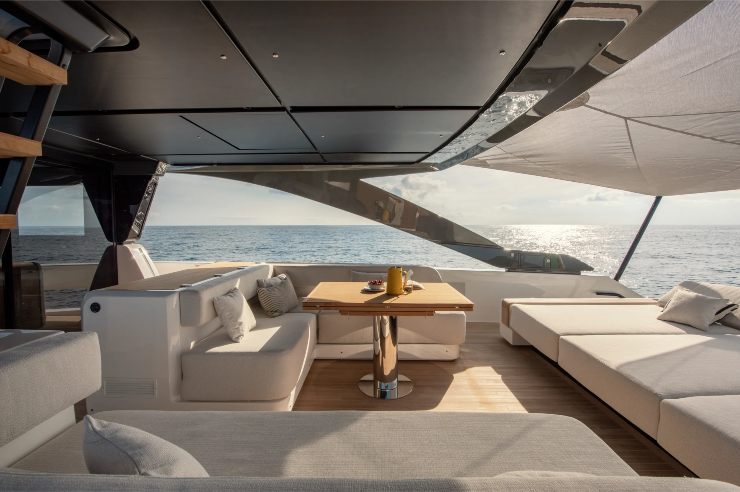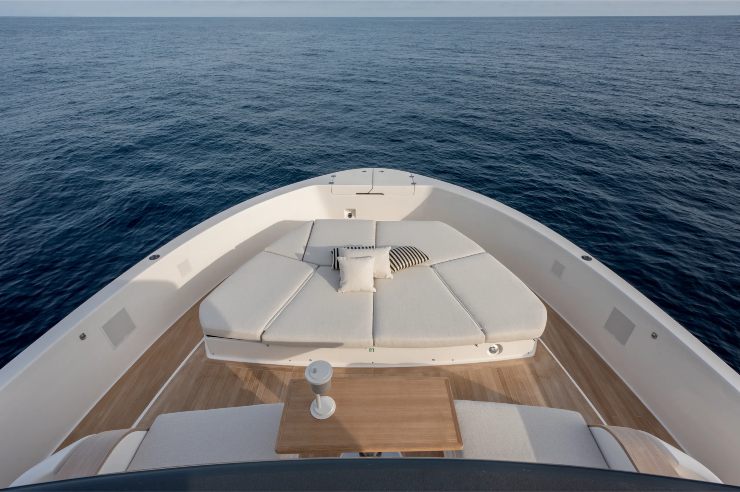 Non si tratta soltanto di estetica. La barca è disegnata per indirizzare il movimento a bordo: i passaggi laterali, le soglie, le aree lounge e la relazione tra poppa, pozzetto e prua creano un flusso che riduce attriti e interferenze. È un’architettura che privilegia la vita all’aperto, ma lo fa con una maturità tipica di unità pensate per essere usate anche con condizioni meteo variabili.