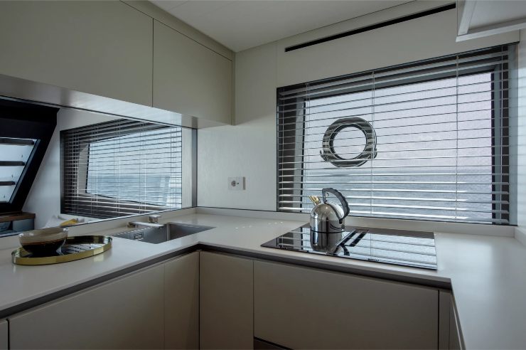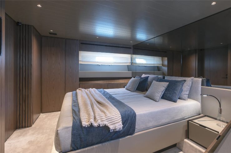 Gli interni, spesso declinati con essenze e finiture pregiate (come soluzioni in noce Canaletto), puntano a un lusso non urlato. L’aspetto cruciale, oltre alla qualità estetica, è la “messa in sistema”: pannellature, cablaggi, impianti e ispezionabilità. In un 74 piedi moderno la vera differenza si vede dove non si guarda: passaggi tecnici ordinati, accessi intelligenti e integrazione pulita tra mobili e componenti impiantistici, così da ridurre vibrazioni, rumori e complicazioni manutentive nel ciclo di vita.