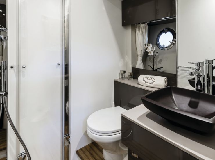 La presenza di due bagni completi, uno collegato alla cabina armatoriale e l’altro a servizio della cabina ospiti e della dinette, aumenta notevolmente la privacy a bordo, soprattutto quando vengono ospitate due coppie. Le docce separate, ove previste, elevano il livello di comfort rispetto a molti competitor della stessa lunghezza.