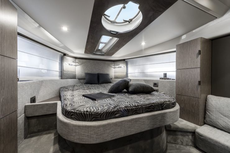 Sottocoperta, il layout del M44 HT è studiato per offrire una vera vivibilità di medio-lungo periodo. A prua è collocata la cabina armatoriale, con letto matrimoniale disposto solitamente lungo l’asse longitudinale della barca, armadiatura su entrambi i lati, vani di stivaggio sotto il materasso e accesso diretto al proprio bagno. Le finestrature laterali e gli oblò apribili assicurano luce naturale e ventilazione, mentre l’altezza interna consente un movimento agevole.