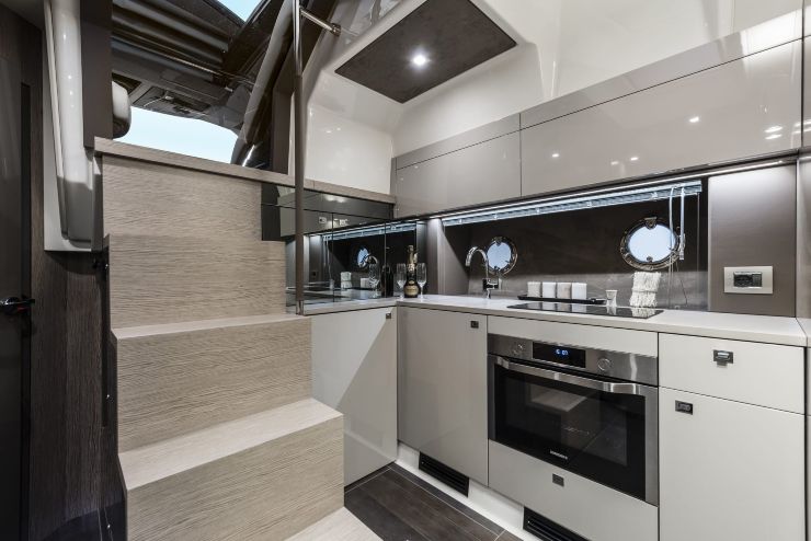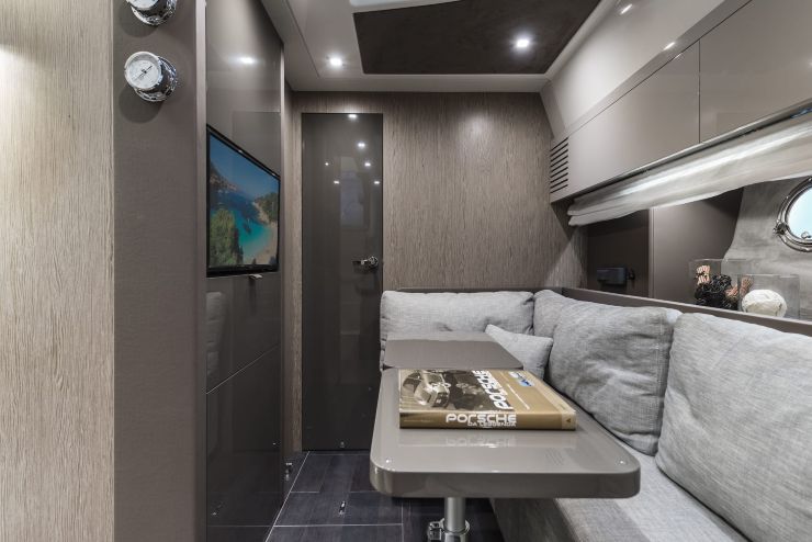 Negli interni l’accoppiata fra pannelli in essenza, superfici laccate, materiali compositi e rivestimenti tecnici garantisce un ambiente elegante, resistente all’umidità e facile da mantenere. Il risultato complessivo è una barca dalla costruzione “pulita”, dove l’impiantistica e le strutture risultano facilmente ispezionabili, a beneficio di manutenzione e controlli periodici.