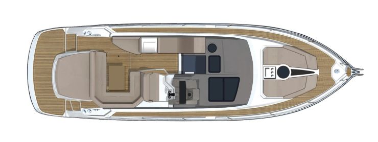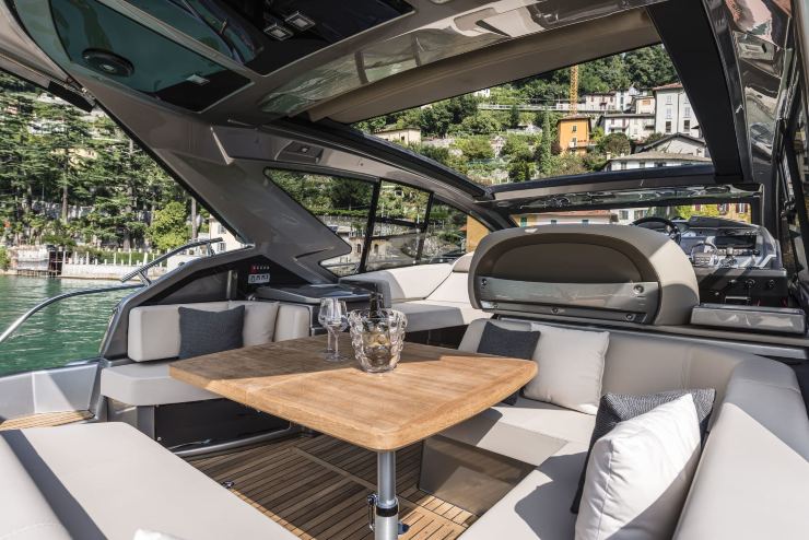 Più a prua, il pozzetto è protetto dall’hard-top e dal parabrezza avvolgente. Qui troviamo una dinette a “C” con tavolo trasformabile, un mobile cucina esterna dotato di lavello, frigorifero e possibilità di grill o piastra, e una postazione di comando ergonomica con seduta regolabile, poggiapiedi e disposizione razionale della strumentazione. Il tetto scorrevole, quando aperto, inonda di luce la zona timoneria e parte della dinette, creando un ambiente arioso anche in navigazione.