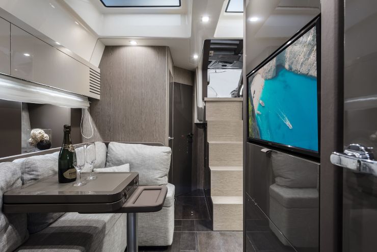 Il progetto presta grande attenzione ai particolari che fanno la differenza nell’uso quotidiano: corrimani ben posizionati su scale e passaggi, gradini uniformi e privi di spigoli, gavoni profondi e ben organizzati, superfici antisdrucciolo dove necessario. A livello di dotazioni, trovano spazio impianti audio multi-zona, TV a schermo piatto, luci di cortesia, prese USB e 230 V distribuite, oltre a possibili optional come ice-maker, frigoriferi supplementari o sistemi di intrattenimento avanzati. Tutto è pensato per rendere semplice la permanenza a bordo anche per periodi prolungati.