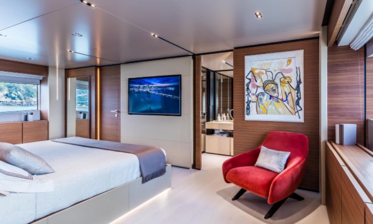 La suite armatoriale posizionata sul ponte principale è una scelta tipica del mondo superyacht, perché separa la vita dell’armatore dai percorsi degli ospiti e migliora privacy e qualità acustica. Inoltre, consente un rapporto diretto con le visuali laterali e con la luce naturale, aumentando la percezione di spazio e rendendo l’ambiente più “abitabile” durante la crociera prolungata.
